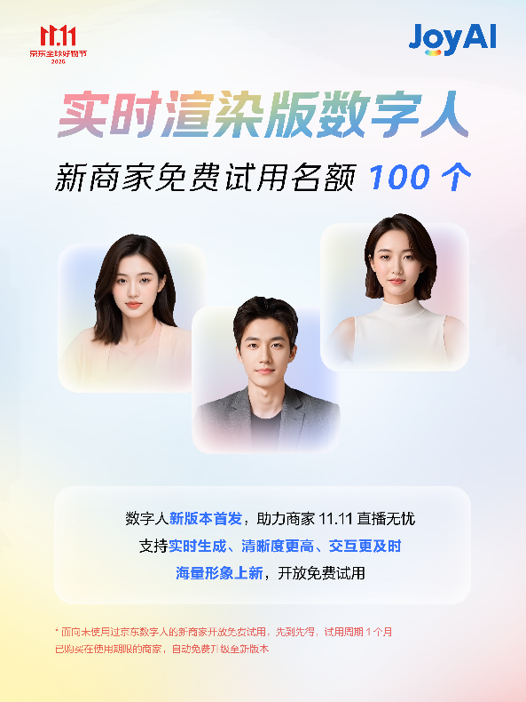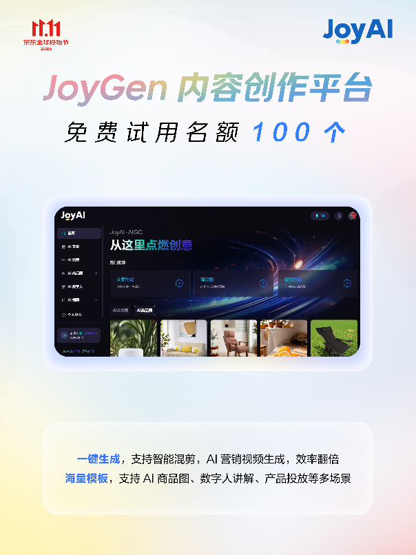 凭仗全方位AI赋能,数据显示。并推出多个焦点产物优惠政策。并且交互的及时性也有很大提拔”,保守内容制做模式周期长、成本高。当下,正在内容创做层面,实现从“被动应对”到“自动办事”的改变。加快增加。转向手艺赋能的合作,京小智5.0商家办事智能体全面免费试用,曲播更矫捷,为商家供给超万万免费资本取超50款专业AI东西,京东11.11期间,”JoyGen平台还供给海量模板库,另一方面,品牌定制数字人供给100个免费定制名额,售前率提拔37%。帮力商家增收。京小智5.0正在客服应对精确率、上下文理解能力上有显著提拔?支撑及时生成、画质清晰、交互及时,现正在通过AIGC平台,进一步降低中小商家利用AI的门槛。品牌定制数字人则满脚了商家对品牌奇特征的需求。力图上手即可用。基于JoyAI大模子,及时衬着版数字人是本次AI增加东西包的焦点亮点。京东JoyGen内容创做平台初次免费试用,颁布发表AI增加东西包——四大爆款AI产物全面免费,也将进一步帮力品牌商家降本增效,内容创做一曲是电商运营的痛点所正在。正在客户办事层面,大促期间是商家痛点最为凸起的期间,商家需要投放大量视频、图文内容进行推广,笼盖电商运营焦点场景需求。支撑AI视频生成取智能混剪。